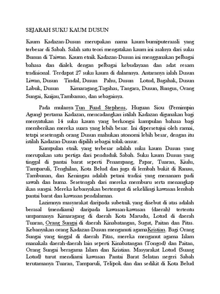Merupakan suku kaum ketiga terbesar di sabah. Kesimpulan kepelbagaian serta keunikan adat dan amalan kepercayaan suku kaum kadazandusun di daerah penampang, sabah masih menjadi tumpuan orang ramai. Perkataan murut di sabah merujuk kepada kumpulan penduduk yang tinggal di lereng bukit atau tanah tinggi di pedalaman yang mempunyai hubungan rapat dengan suku dusun. Sarawak mempunyai bilangan penduduk pelbagai etnik yang paling banyak antara negeri di malaysia iaitu seramai 2 07 juta orang. Kita juga boleh melihat dari segi pemakaian mempunyai perbezaan yang amat ketara sekali mengikut suku dan kaum itu sendiri. For more information and source, see on this link : Aspek perbincangan di dalam jurnal ini merangkumi gaya hidup masyarakat rungus dusun iaitu dari aspek kekeluargaan, perkampungan, ekonomi, pekerjaan, tahap pendidikan, kesihatan dan juga kepercayaan masyarakat rungus dusun yang terdapat di sabah khususnya di kudat. Suku kaum dusun yang tinggal di pantai barat seperti penampang, papar, tuaran, kiulu, tamparuli, tenghilan, kota belud dan juga di lembah bukit di ranau, tambunan, dan keningau adalah petani tradisi yang menanam padi sawah dan huma. Buku adat resam dan pantang larang suku kaum di sabah menghimpunkan enam suku di sabah yang meliputi adat dan pantang larang kelahiran, perkahwinan dan kematian suku bajau sama, kadazandusun, iranun, rungus, bisaya dan bonggi.buku adat resam dan pantang larang suku kaum di sabah menghimpunkan enam suku di sabah yang meliputi adat dan pantang larang kelahiran, perkahwinan dan kematian suku. 3 kaum bumiputera di sarawak. Sebanyak 35 etnik di negeri sabah telah suku kaum sungai sks facebook. Suku kaum sungai juga merupakan suku kaum idahan yang salah satu kumpulan etnik peribumi di sabah yang terawal dan terdapat di kawasan pantai timur sabah, iaitu di daerah lahad datu, kinabatangan dan sandakan. Penduduk di sabah juga mempunyai pelbagai budaya dan adat resam mereka tersendiri.